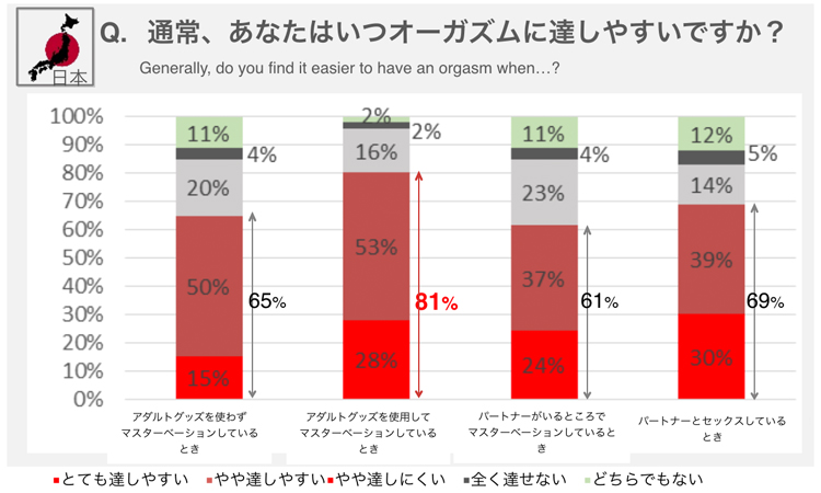 また、 「通常、あなたはいつオーガズムに達しやすいと思うか」という質問で、『アダルトグッズを使用して、マスターベーションをしているとき』が81%でトップという結果になっており、『パートナーとセックスしているとき 69%』、『アダルトグッズを使わずマスターベーションをしているとき 65%』、 『パートナーがいるところでマスターベーションしているとき 61%』を上回る結果となりました。